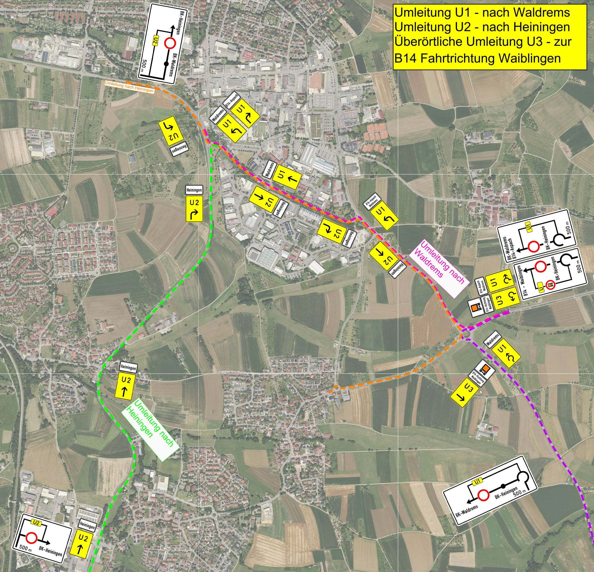 Im ersten Bauabschnitt wird der Geh- und Radweg Richtung Heiningen hergestellt, die Bushaltestelle barrierefrei ausgebaut und Wasserleitungen erneuert. Dazu ist eine halbseitige Sperrung mit Ampelregelung notwendig. Für den Durchgangsverkehr zur und von der B 14 werden großräumige Umleitungen ausgeschildert.