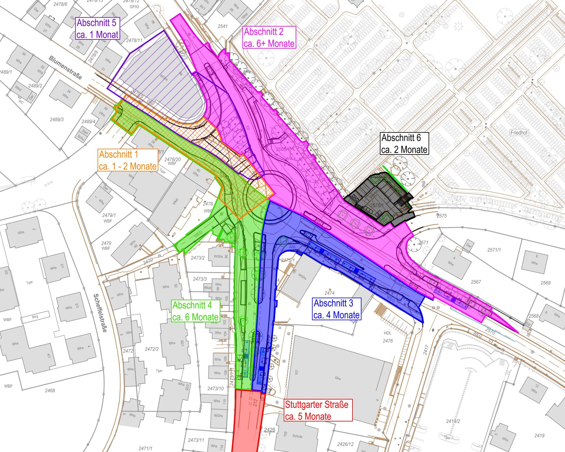 Die Baumaßnahme ist in insgesamt sieben Bauabschnitte unterteilt. Die einzelnen Bauphasen sind in dem vorhergehenden Lageplan dargestellt.