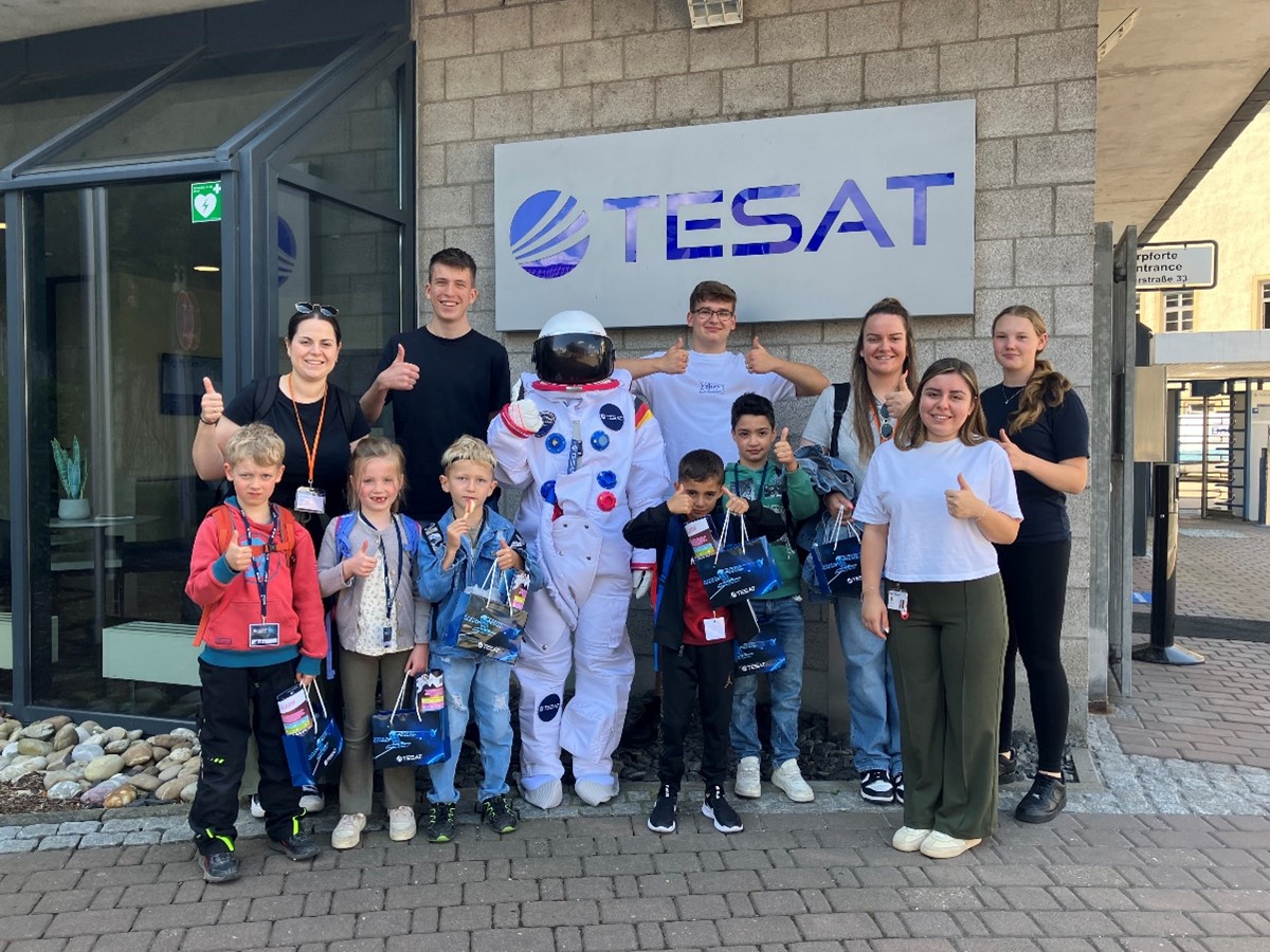 Der Höhepunkt war schließlich der Besuch bei Tesat selbst. Dort wurden die Kinder herzlich empfangen und mit auf eine altersgerechte Firmenführung genommen. Gespannt lauschten sie den Erklärungen und beobachteten die verschiedenen Experimente. Besonders beeindruckend waren die Experimente, bei denen die Kinder selbst aktiv werden konnten, wie z.B. einen Heißluftballon steigen lassen oder zwei Satelliten miteinander kommunizieren lassen. Als dann am Ende noch ein Astronaut mit leckerem Eis vorbeikam, kamen die Kinder aus dem Staunen nicht mehr heraus.