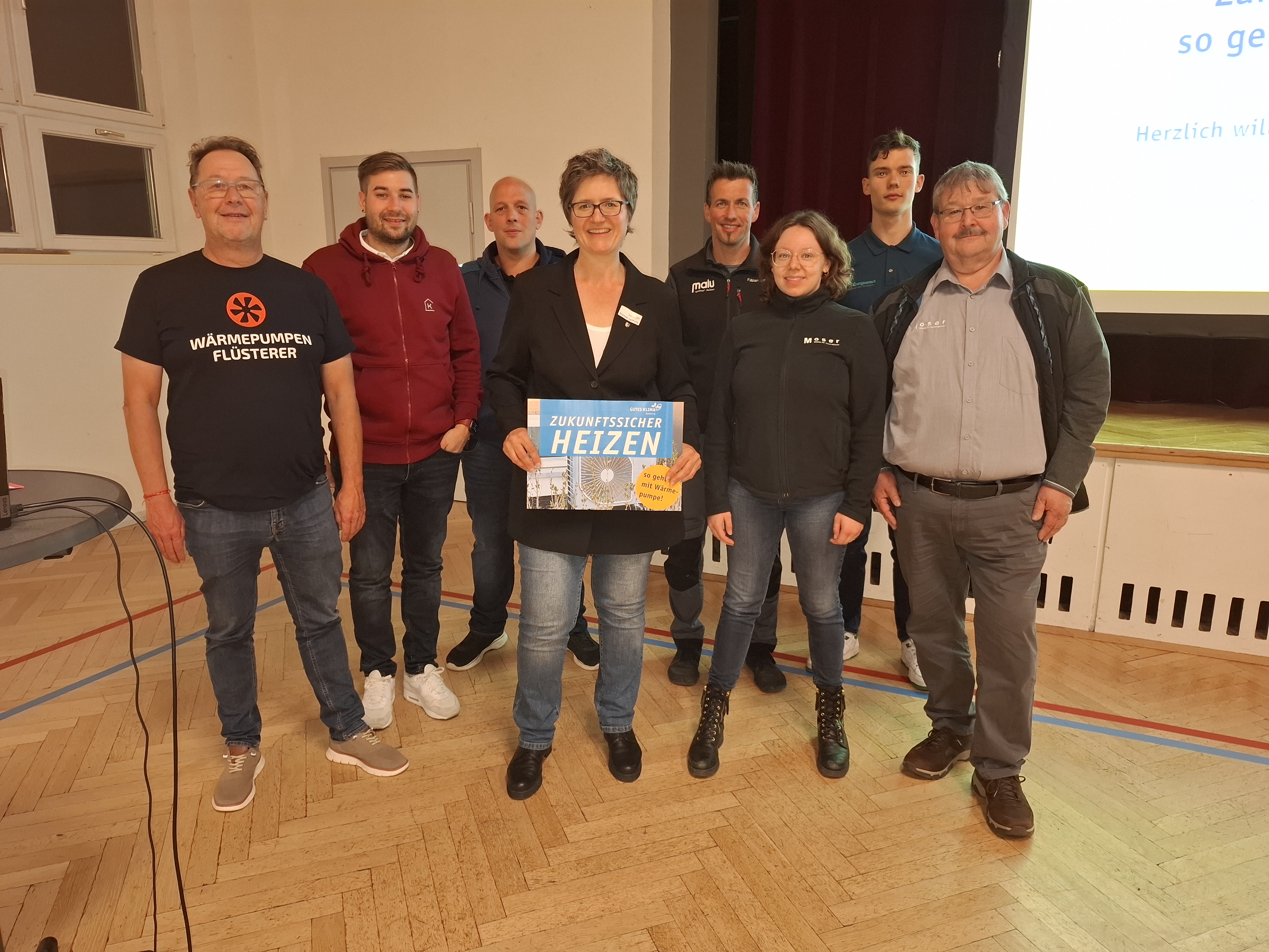 Bei der Wärmepumpen-Veranstaltung im Matthäus-Gemeindezentrum haben folgende Experten unterstützt - von links nach rechts: Simone Lebherz (Klimamanagerin, Stadt Backnang), Daniel Knödler (Knödler Heizungsbau, Auenwald), Fabian Lutz (malu GmbH, Weissach im Tal), Manfred Lang (Wärmepumpenbesitzer, Backnang), Harald und Julia Moser (Moser GmbH, Backnang), Timo Froner (Rausch GmbH, Sulzbach/Murr), Steffen Neudert (BK-EnergyConsult, Backnang), Ingo Hein (hein.engineering, Kirchberg an der Murr)