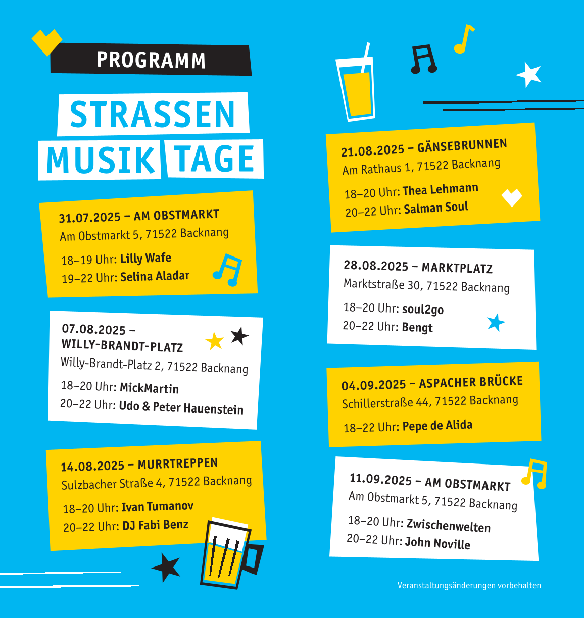 An insgesamt sieben Donnerstagen im Zeitraum vom 31. Juli bis zum 11. September 2025 veranstaltet das Kultur- und Sportamt der Stadt Backnang die dritten „Straßen Musik Tage“.