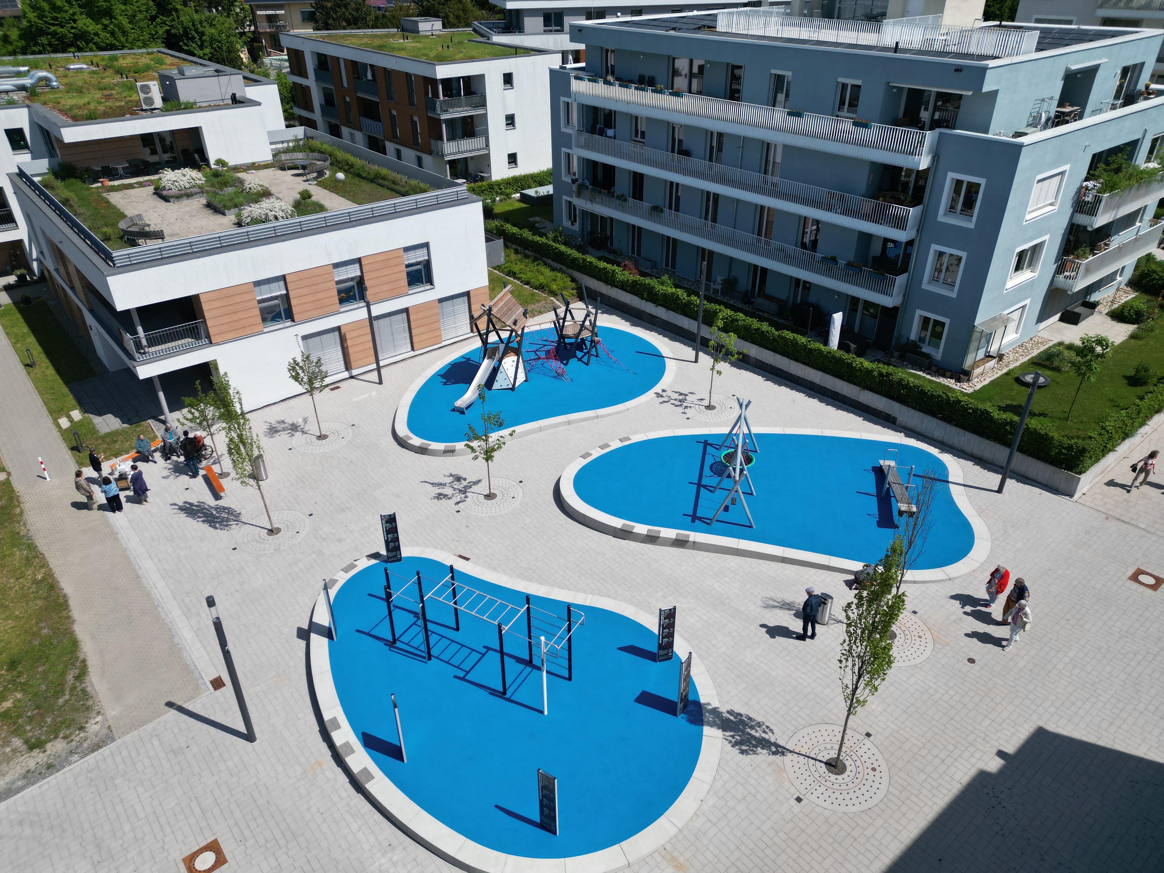 Der durch die Kreisbau errichtete Platz bildet das Herzstück des Wohnquartiers. Gestaltet wurde er mit drei organischen Spielhügeln, deren Ausstattung in einem Beteiligungsprozess gemeinsam mit den Anwohnenden entwickelt wurde. Entstanden ist ein Ort mit vielseitigen Bewegungsangeboten für unterschiedliche Altersgruppen, von Spielmöglichkeiten für Kinder bis hin zu Geräten für die Erwachsenenbewegung.