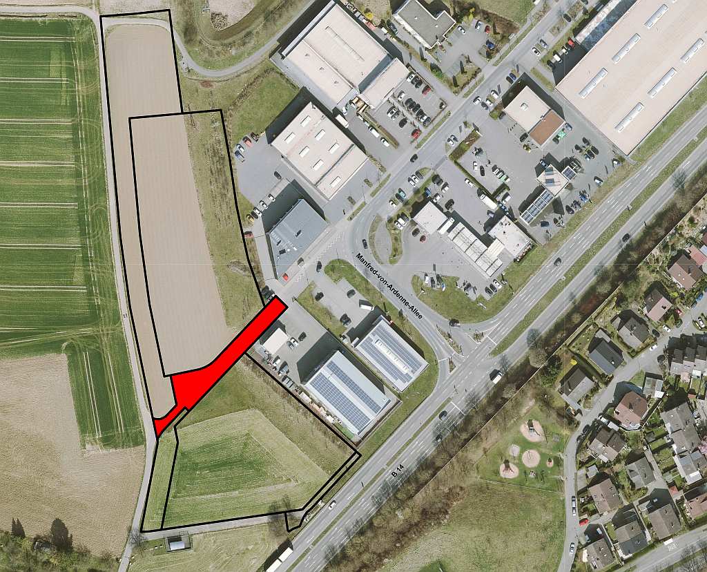 Die verkehrliche Erschließung des Erweiterungsgebiets erfolgt über eine Verlängerung der dort bestehenden Stichstraße der Manfred-von-Ardenne-Allee mit einer Straßenbreite von 6,4 Metern. Die Straßenverlängerung beträgt circa 70 Meter und erhält eine Wendeanlage mit einem Wendekreisdurchmesser von 12 Metern. An der Nordseite der Erschließungsstraße wird ein Gehweg mit einer Breite von 1,8 Metern bis zum Anschluss an den bestehenden Wirtschaftsweg hergestellt, so dass eine durchgehende Verbindung für den Fußverkehr gesichert ist. Die Fahrbahn wird in Asphaltbauweise und der Gehweg mit Betonverbundpflaster erstellt.