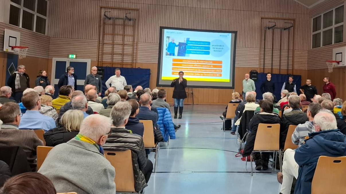 Zahlreiche Gebäudebesitzer haben die Gelegenheit genutzt, sich in der Maubacher Mehrzweckhalle über zukunftsfähige Heizoptionen zu informieren. Von vielen Gästen kam die Rückmeldung, dass der Vortrag gut verständlich hilfreiches Basiswissen vermittelt hat. Ein Großteil der mehr als 100 Besucher nutzten auch das Angebot, im Anschluss beim Ständerling mit den anwesenden Wärmepumpenbesitzer, Heizungsbauern und Energieberater konkrete Fragen zu diskutieren und sich praktische Tipps zu holen. Die an den Wänden präsentierten Steckbriefe von Wärmepumpen aus Backnang und Umgebung boten viele Anknüpfungspunkte für interessante Gespräche.